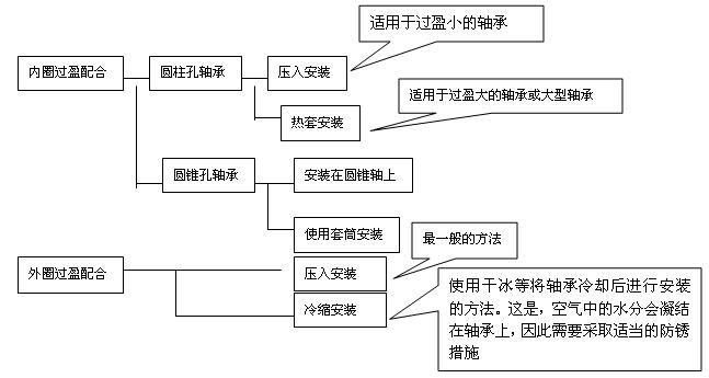 轴承的安装应根据轴承结构,尺寸大小和轴承部件的配合性质而定,压力应直接加在紧配合得套圈端面上,不得通过滚动体传递压力,轴承安装一般采用如下方法: